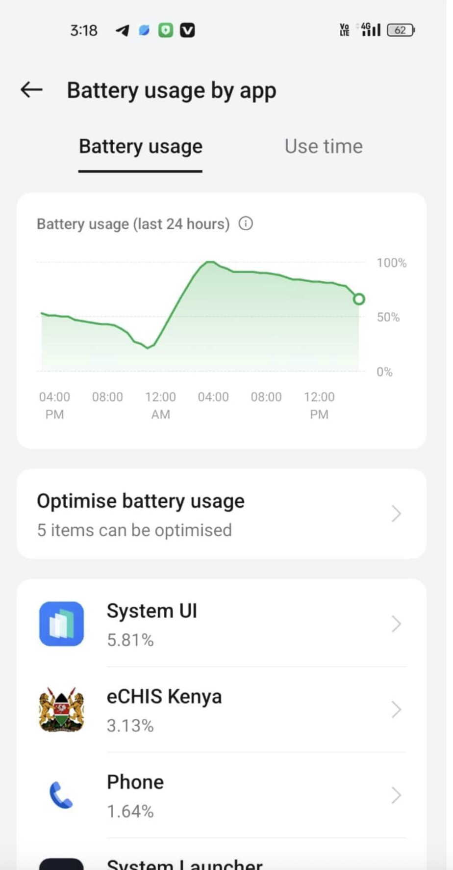I engaged some CHWs in Kenya to understand how the eCHIS app ranks in power utilisation. This involved sharing the https://www.androidpolice.com/how-to-find-apps-draining-phone-battery/ application and getting extracts from their phones, as shared below